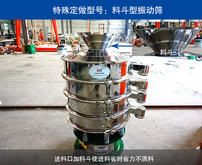 進(jìn)料口加料斗型振動(dòng)篩是在普通振動(dòng)篩的進(jìn)料口上蓋上加裝一個(gè)漏斗型的進(jìn)料斗,可以在人工加料時(shí)節(jié)省時(shí)間力氣并且進(jìn)料過(guò)程中不會(huì)灑料造成物料的浪費(fèi)。