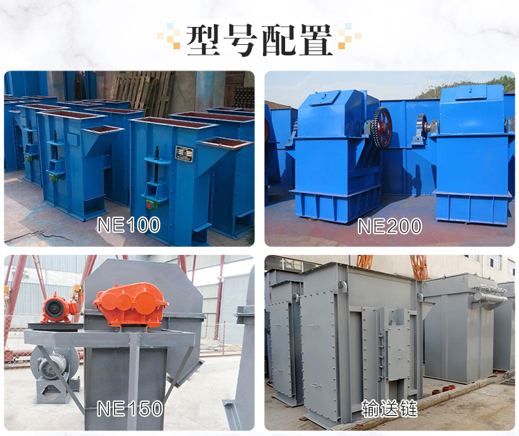 散裝物料板鏈斗式提升機擁有大小不同的11種型號以及不同配置,型號有NE15、NE30、NE50 、NE100、NE150、NE200、NE300、NE400、NE500、NE600、NE800等,不同大小型號的提升機配置(料斗、鏈條、振動電機)選用的都不同所以價格也會有所不同,提升產(chǎn)量越大所選擇的料斗規(guī)格與電機功率也就越大。