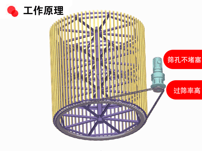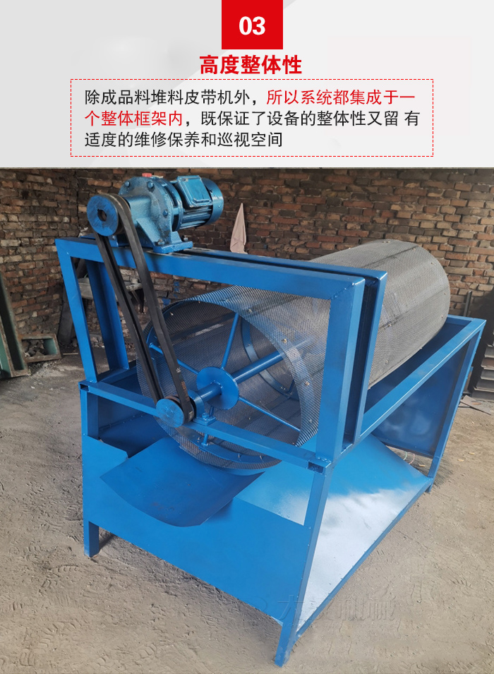 該產(chǎn)品的主要依靠驅(qū)動裝置帶動滾筒篩網(wǎng),對于物料做360°旋轉(zhuǎn)時篩分,在滾動篩網(wǎng)的作用下,物料能夠輕松的達到分散的狀態(tài),從幫助篩網(wǎng)進行快速的篩分。通過篩網(wǎng)網(wǎng)孔的物料留到皮帶輸送機上,由出料口排出,而沒有通過篩網(wǎng)篩分的將從肥料口排出,從而完成物料的篩分目的。