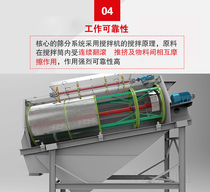 其核心的篩分系統(tǒng)采用攪拌機的攪拌原理,原料在攪拌筒內(nèi)受連續(xù)翻滾、推擠及物料間相 互摩擦作用,作用強烈可靠性高。