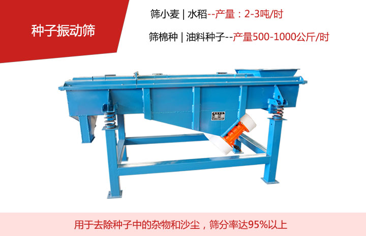 種子振動篩主要是去除種子中的雜物和沙塵使用,該機(jī)篩選大豆和玉米每小時3-5噸,篩選小麥和水稻每小時2-3噸,篩選棉種和油料種子每小時500-1000公斤。對糧食和油料里面的灰塵,碎屑,壞糧及小石子等雜質(zhì),篩分率達(dá)到95%以上。